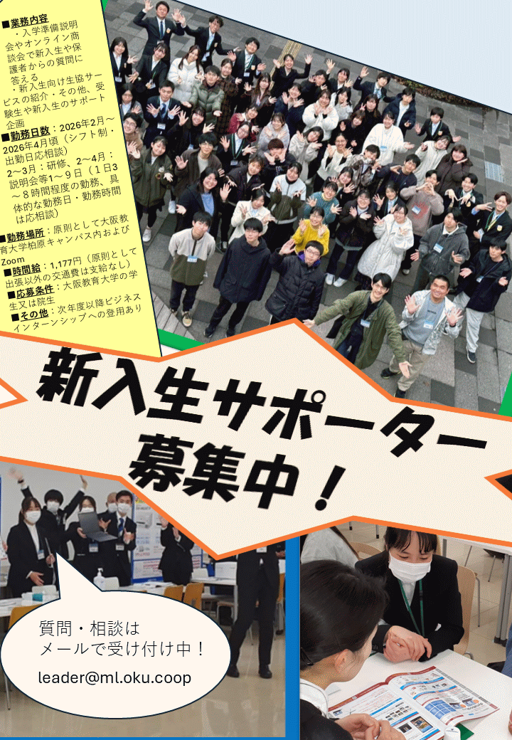 - メール:leader@ml.oku.coop(受験生/新入サポートリーダー)