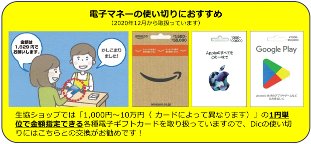 ※電子マネー(Dic)の残高がある場合は、卒業式までに使いきるようお願いいたします。[規約に準じて、原則として返金は行っておりません。生協ショップでは1,000円~10万円で金額指定できる各種電子ギフトカードも取り扱っていますので、そちらとの交換(電子ギフトカードのご購入)がお勧めです。]