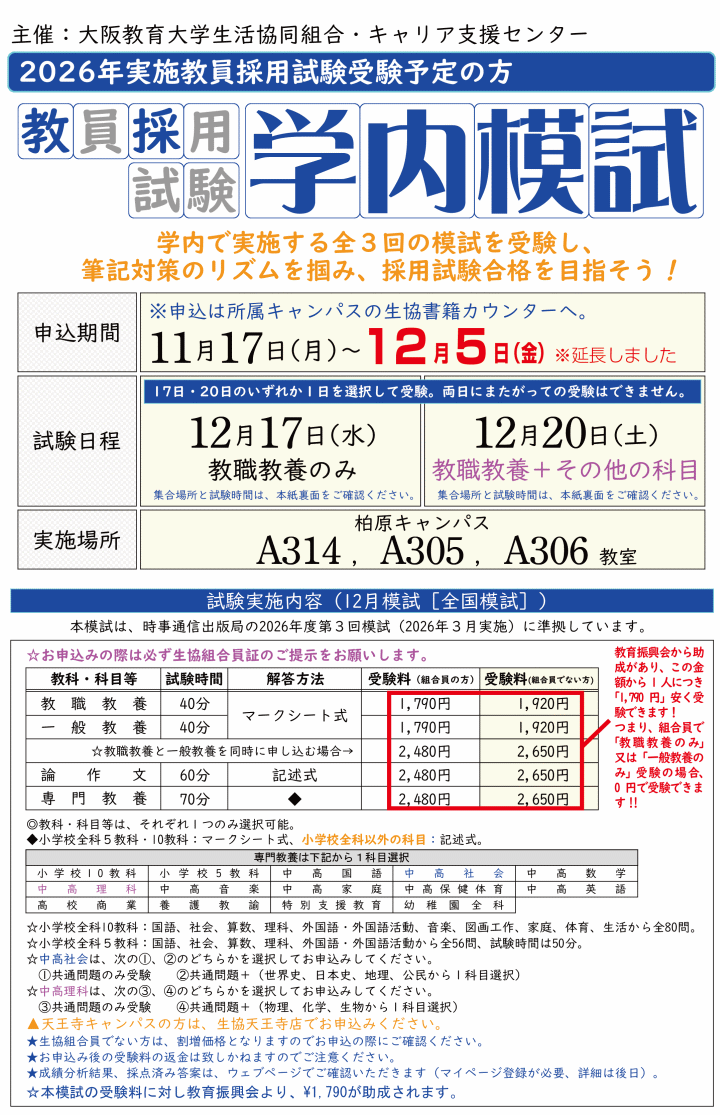 教員採用学内模試!受付中!!(教育振興会から1人につき「1,790円」助成!)