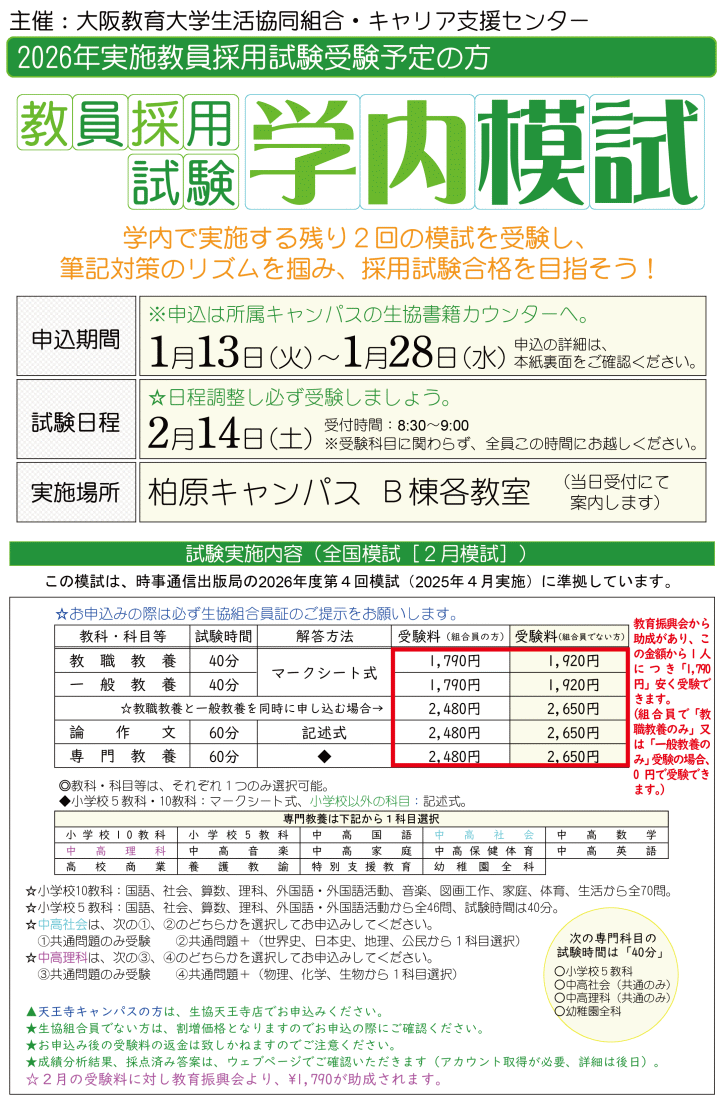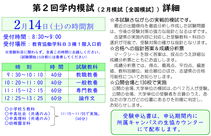 【2/14(土)開催】教員採用学内模試!受付中!!(教育振興会から1人につき「1,790円」助成あり)