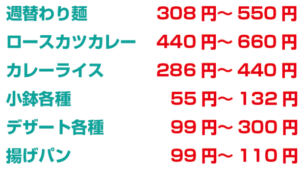 ●メニュー:「日替わり肉定食」「日替わり魚定食」「麺」「カレー」「小鉢」「デザート」等