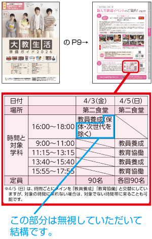 お送りしている資料「大教生活」のP9「大教ツール攻略・相談会」の開催日時・対象学科(専攻コース等)に左記の誤りがございました。